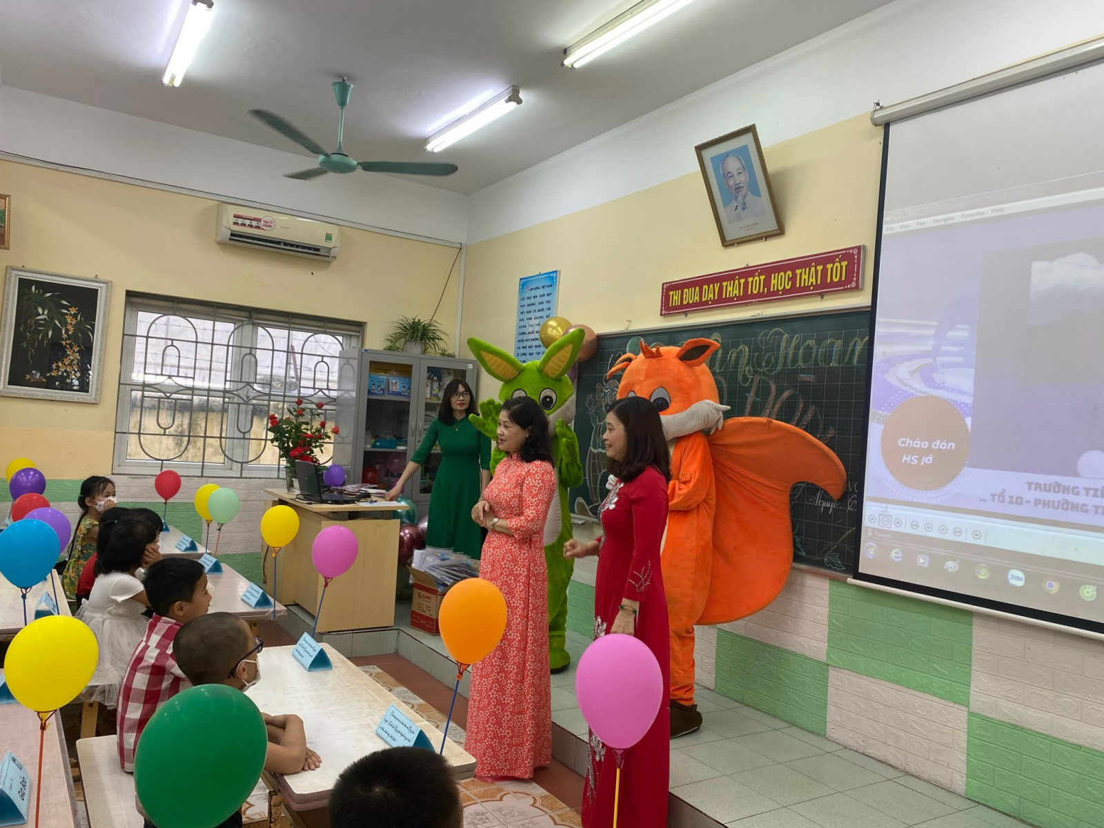 Hình ảnh cô Hiệu trưởng Nguyễn Thị Thúy Mai trong ngày đón học sinh lớp 1