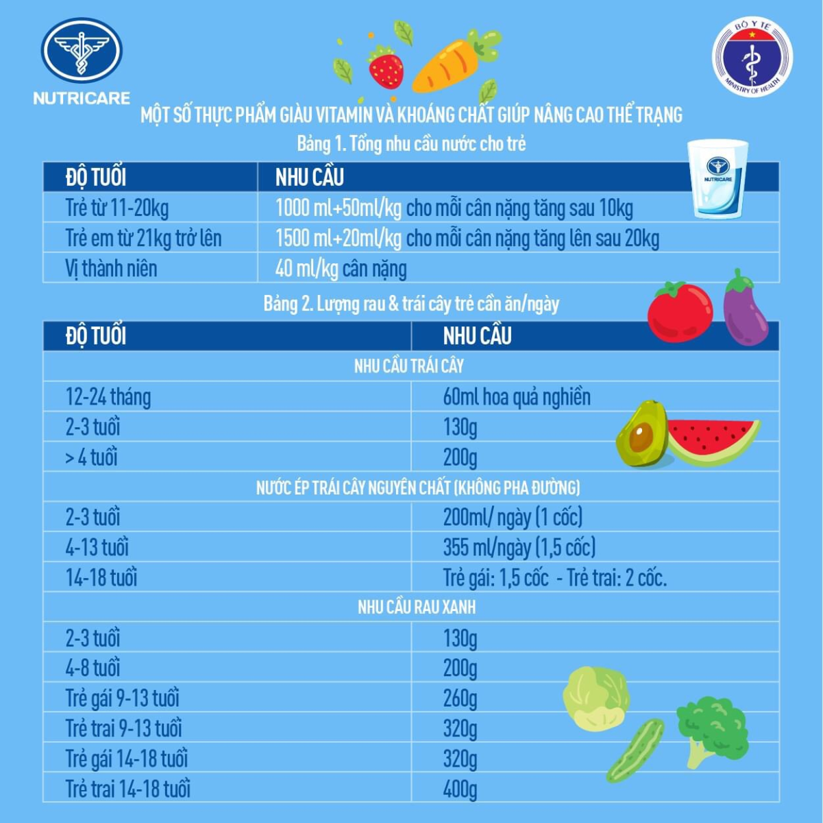 Một số thực phẩm giàu vitamin và khoáng chất giúp nâng cao thể trạng theo độ tuổi – nhu cầu của trẻ theo hướng dẫn của Bộ Y tế: