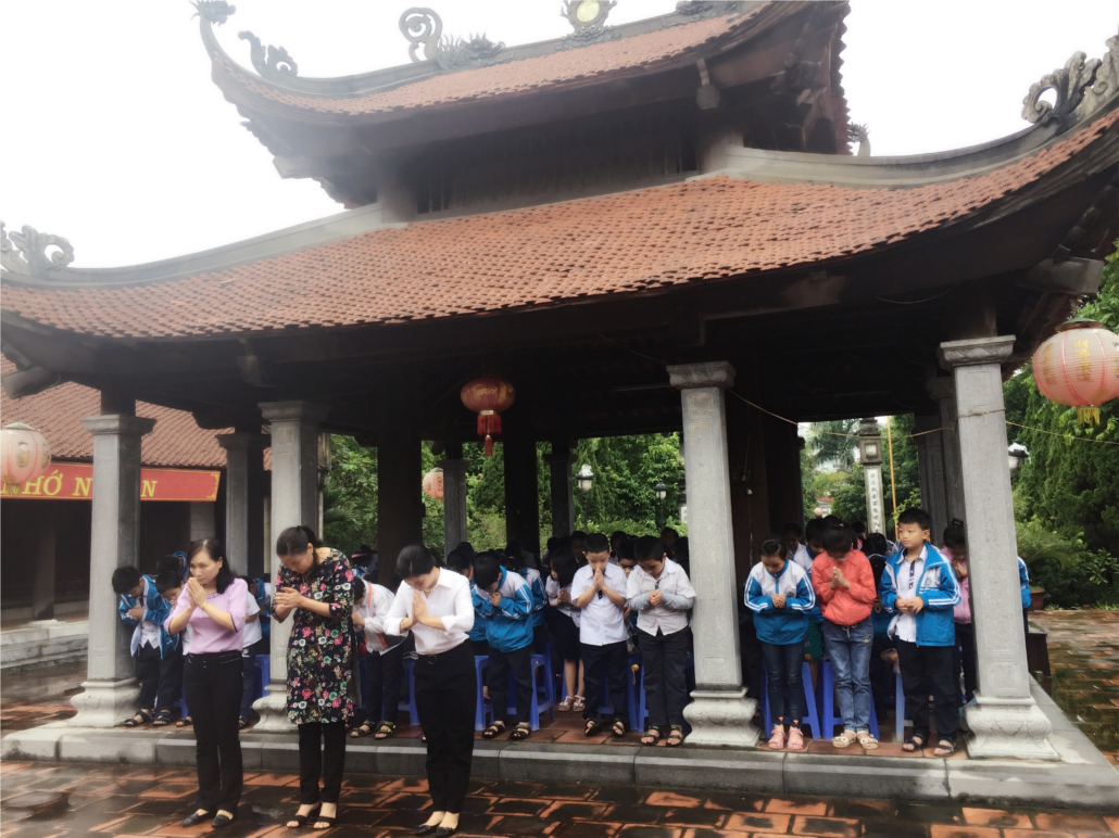 Học sinh thành kính làm lễ trong đình Lệ Mật và nghe giới thiệu về lịch sử đình làng lệ Mật