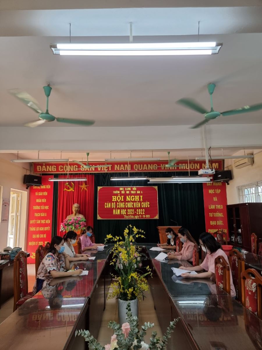 Từ ngày 04/10/2021 đến ngày 09/10/2021, trường Tiểu học Thạch Bàn A mở cuộc họp trù bị cho Hội nghị công chức, viên chức và người lao động được dự kiến tổ chức vào ngày 11 tháng 10 năm 2021. Bên cạnh đó, nhằm đảm bảo công tác phòng chống dịch bệnh Covid-19, nhà trường đã phân công lịch họp riêng cho các tổ khối.