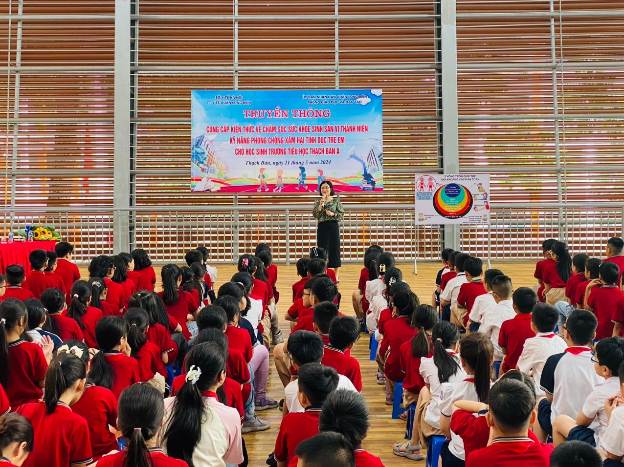 Thực hiện kế hoạch số 88/KHLT-TTYT-GD&ĐT ngày 23/4/2024 của TTYT-Phòng GD&ĐT quận Long Biên về việc Tổ chức tuyên truyền về chăm sóc sức khỏe sinh sản vị thành niên tại các trường Trung học cơ sở và Tiểu học trên địa bàn quận Long Biên, sáng ngày 21/5/2024, Trường Tiểu học Thạch Bàn A phối hợp với Trung tâm Y tế quận Long Biên, TYT phường Thạch Bàn, Phòng GD&ĐT Quận Long Biên tổ chức buổi truyền thông về chăm sóc sức khỏe sinh sản vị thành niên và kỹ năng phòng, chống xâm hại tình dục trẻ em cho học sinh khối lớp 4, 5. Buổi tuyên truyền nhằm nâng cao nhận thức về sức khỏe sinh sản vị thành niên, cung cấp thông tin, kiến thức đầy đủ, chính xác về chăm sóc sức khỏe sinh sản vị thành niên, phòng chống xâm hại tình dục cho học sinh.