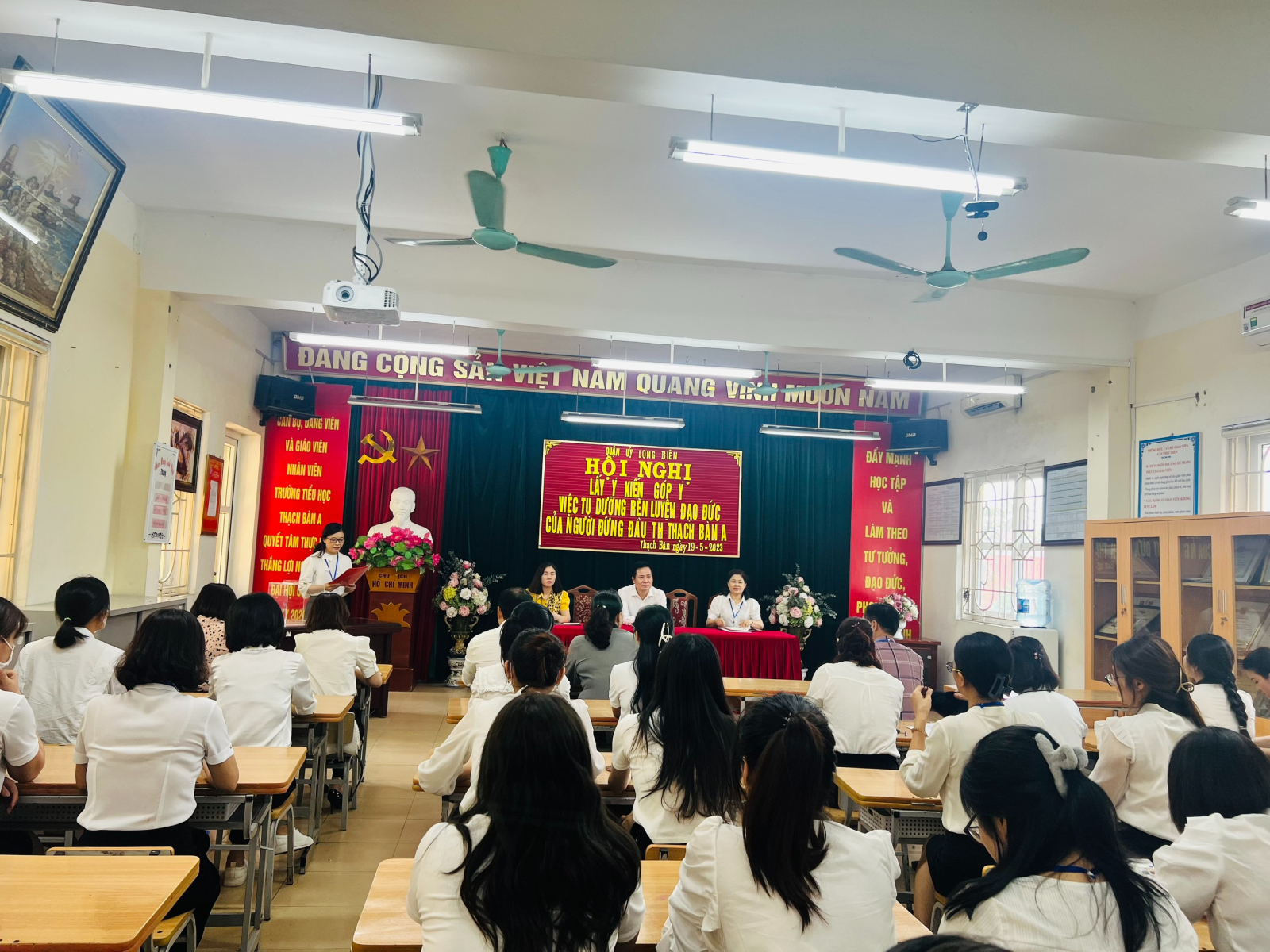 Thực hiện Kế hoạch số 167-KH/QU, ngày 27/01/2023 của Ban Thường vụ Quận ủy về “Lấy ý kiến góp ý việc tu dưỡng, rèn luyện đạo đức gắn với trách nhiệm nêu gương của người đứng đầu các địa phương và một số trường học công lập trên địa bàn quận Long Biên năm 2023” và kết quả hội nghị triển khai kế hoạch ngày 24/02/2023 của Quận uỷ; Công văn số 2021-CV/QU, ngày 21/04/2023 của Quận ủy Long Biên về “Tổ chức lấy ý kiến góp ý đối với người đứng đầu một số trường mầm non, tiểu học, THCS công lập trên địa bàn Quận”, chiều ngày 19/5/2023, cấp ủy chi bộ trường Tiểu học Thạch Bàn A tổ chức Hội nghị lấy ý kiến góp ý việc tu dưỡng, rèn luyện đạo đức gắn với trách nhiệm nêu gương của người đứng đầu trường TH Thạch Bàn A năm 2023.