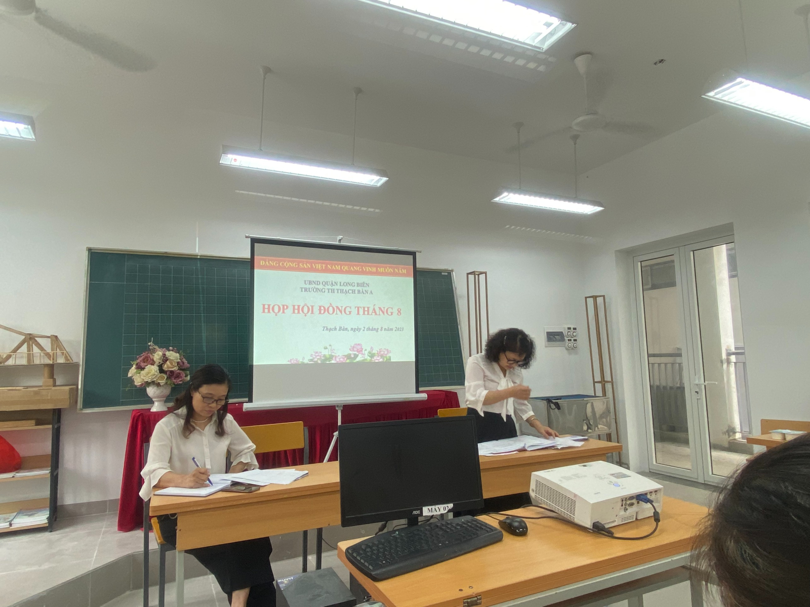 Thực hiện kế hoạch hoạt động của nhà trường, hôm nay, ngày 02/8/2023, hội đồng sư phạm trường Tiểu học Thạch Bàn A đã tiến hành tổ chức buổi họp hội đồng đầu tiên sau kì nghỉ hè, triển khai các nội dung công việc của tháng 8 và tháng 9, phân công chuyên môn năm học mới và chuẩn bị sẵn sàng mọi điều kiện cho năm học mới sắp bắt đầu.