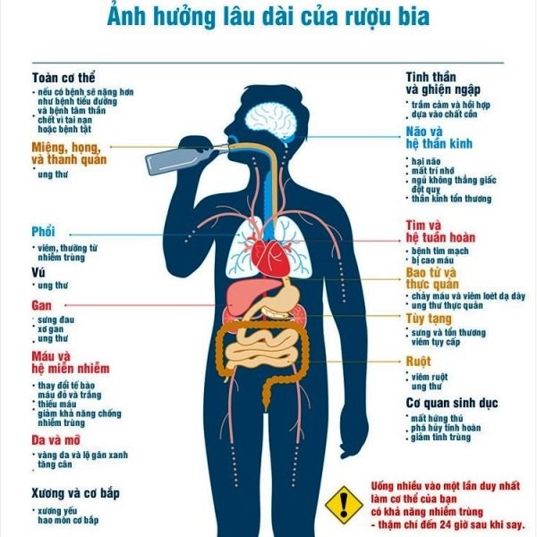 Ngày nay các nhà khoa học đã tìm ra nhiều bằng chứng chứng minh rằng nếu uống quá nhiều rượu bia sẽ tổn hại đến nhiều cơ quan trong cơ thể con người từ hệ thần kinh, hệ tim mạch, hệ nội tiết, đặc biệt là hệ tiêu hóa gan mật.