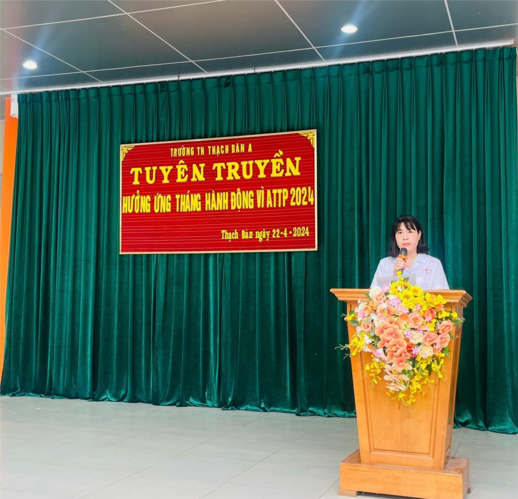 Ngày 22/4/2024 được sự đồng ý của Ban giám hiệu nhà trường, cô Nguyễn Thị Oanh – Nhân viên y tế trường thực hiện tuyên truyền về nội dung Trường Tiểu học Thạch Bàn A đẩy mạnh công tác tuyên truyền và tăng cường công tác đảm bảo an ninh an toàn thực phẩm hưởng ứng “Tháng hành động vì an toàn thực phẩm” năm 2024.