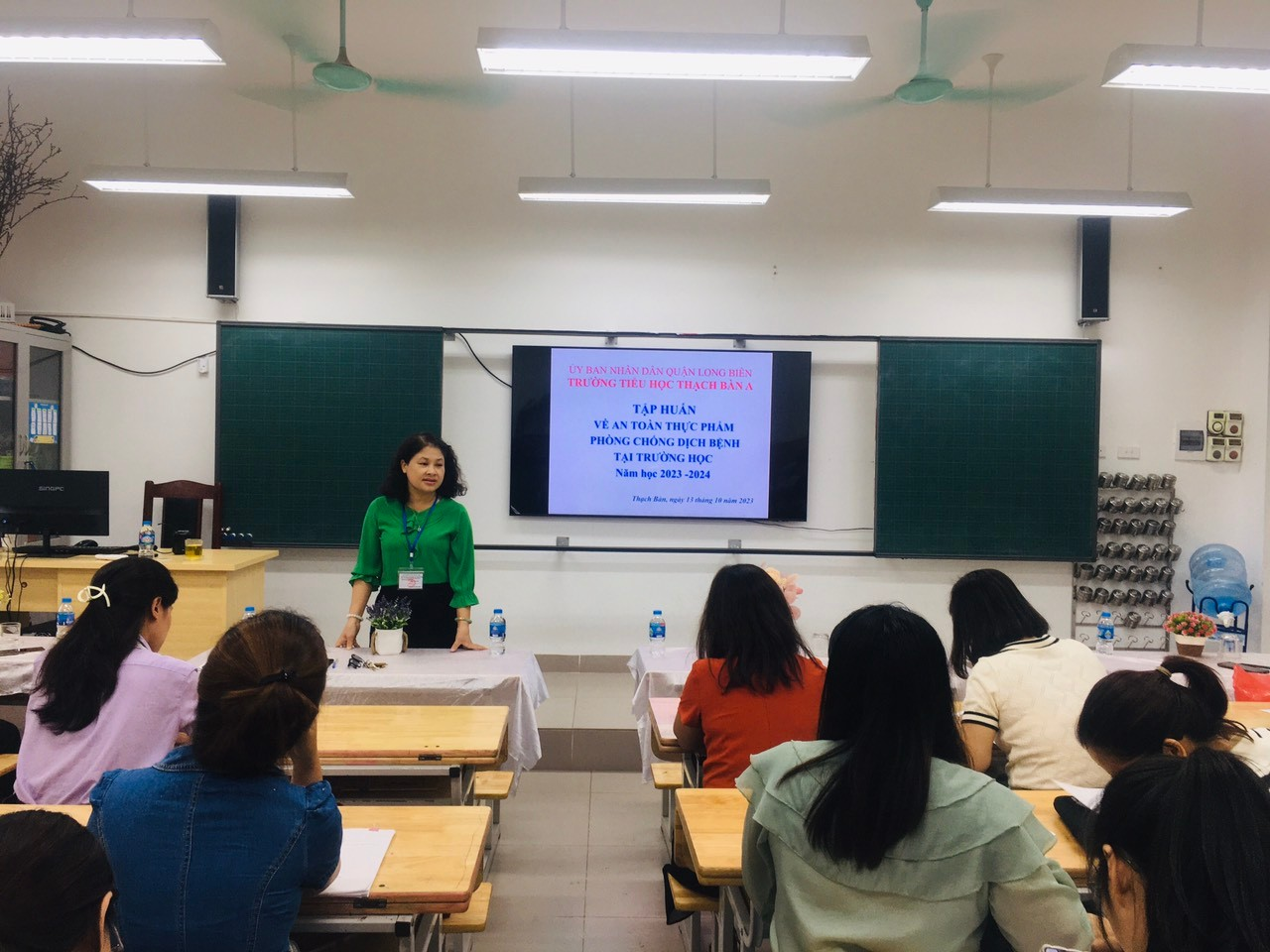 Để chuẩn bị cho năm học mới 2023 – 2024 cũng như nhằm trang bị và cập nhật các kiến thức về vệ sinh an toàn thực phẩm, phòng chống dịch bệnh trong trường học với mong muốn mang đến những bữa ăn không chỉ tươi ngon, đảm bảo các chất dinh dưỡng mà còn lành mạnh, an toàn trong khâu vệ sinh, chế biến, bảo quản tại nhà trường và không xảy ra ổ dịch bệnh lớn trong trường học, chiều ngày 13/10/2023, trường Tiểu học Thạch Bàn A đã phối hợp với Phòng Y tế quận Long Biên tổ chức buổi tập huấn hướng dẫn đảm bảo an toàn thực phẩm và phòng chống dịch bệnh tại trường học cho 41 cán bộ, giáo viên, nhân viên nhà trường.