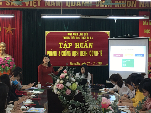 Để cập nhật kiến thức về tình hình dịch bệnh và biện pháp phòng chống bệnh Codid-19 tại trường học cho các đồng chí cán bộ, giáo viên, nhân viên 9h00 ngày 27/02/2020 trường Tiểu học Thạch Bàn A đã tổ chức tập huấn Tình hình dịch bệnh và biện pháp phòng chống bệnh Codid-19 tại trường học cho 41 CBGVNV theo Hướng dẫn phòng chống bệnh Covid-19 (Công văn 787/HDLN/YT-GDDT-LĐTBXH ngày 21/2/2020 của Sở Y tế - Sở Giáo dục và Đào tạo – Sở lao động thương binh và xã hội Hà Nội Hướng dẫn liên ngành về coong tác phòng, chống dịch bệnh Covid-19 trong các cơ sở giáo dục, giáo dục nghề nghiệp).